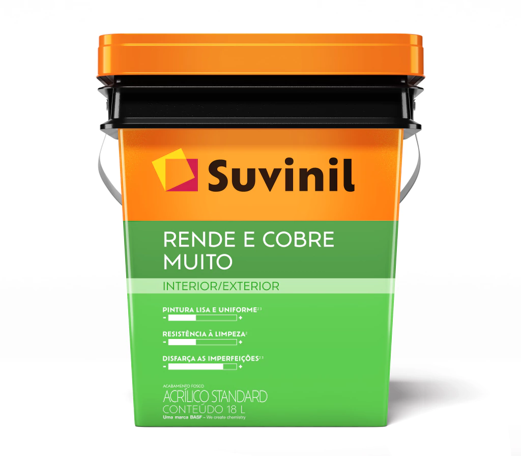Suvinil Rende & Cobre Muito é a tinta que rende mais. O produto possui baixo odor, uma ótima cobertura e um excelente rendimento e ainda é fácil de espalhar. A Rende & Cobre Muito tem uma ótima consistência, o que facilita a aplicação após a sua diluição. Uma tinta fosca com 20 opções de cores para você pintar.